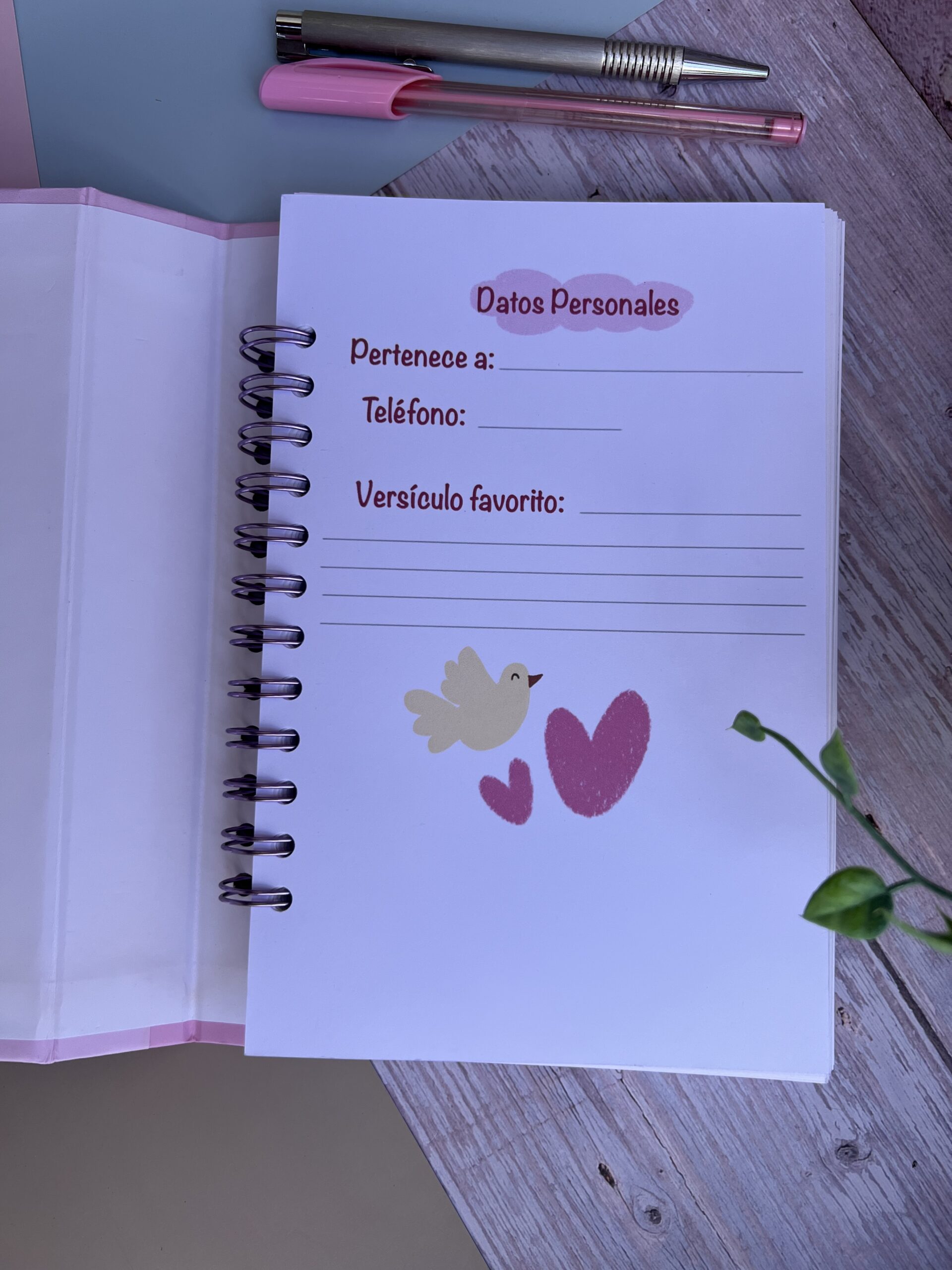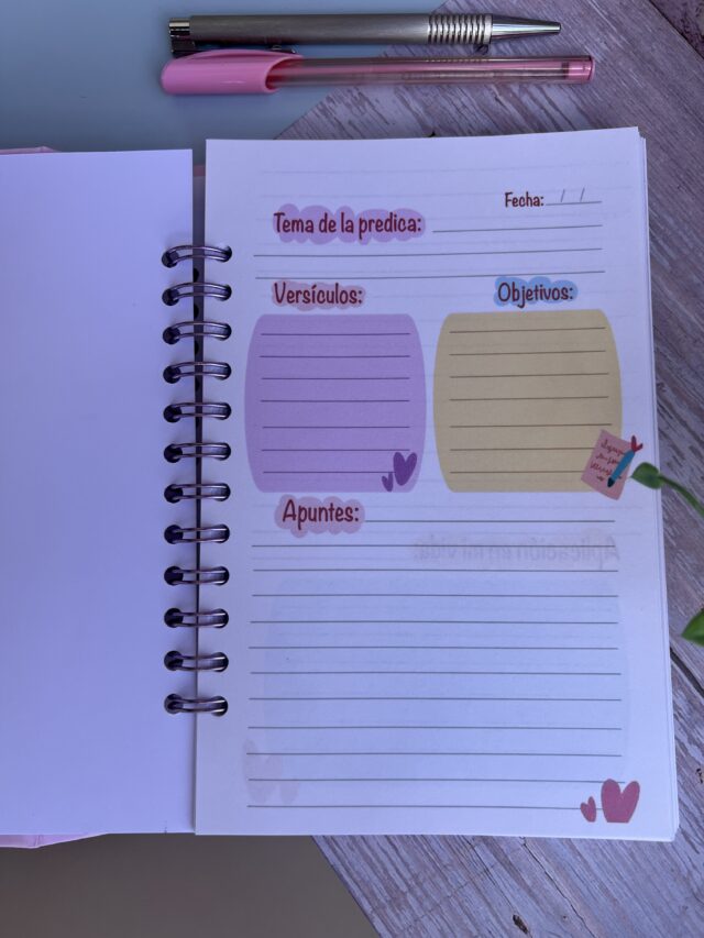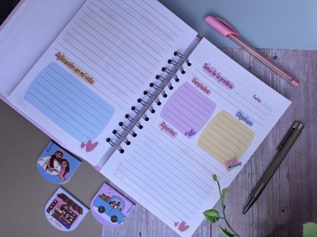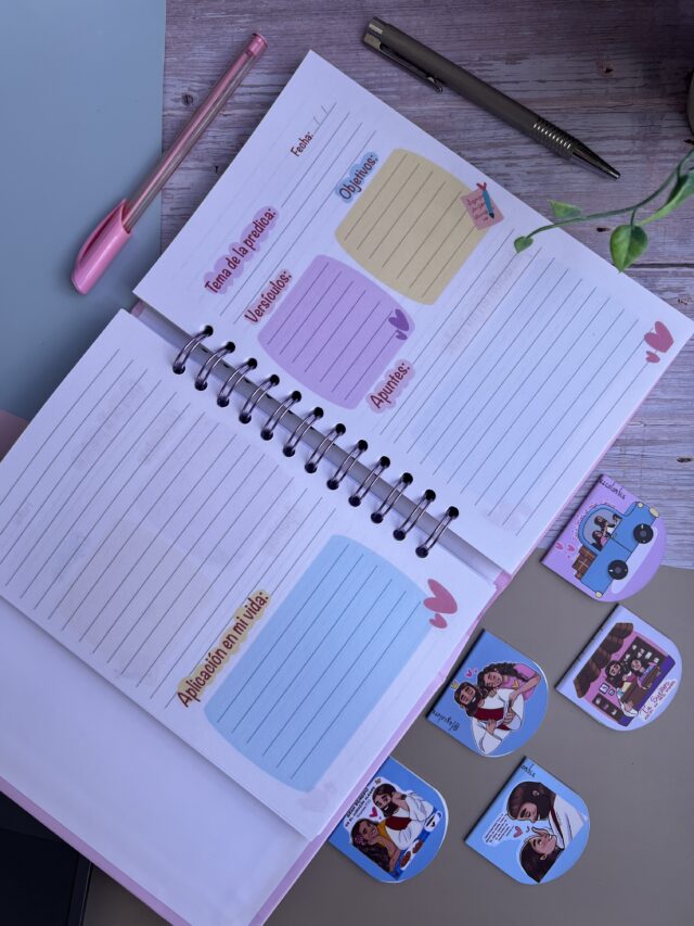 Organiza tus notas de prédicas con este hermoso cuaderno diseñado especialmente para ayudarte a registrar cada enseñanza de manera clara y ordenada. Su diseño único combina fe y colores para inspirarte en cada página.